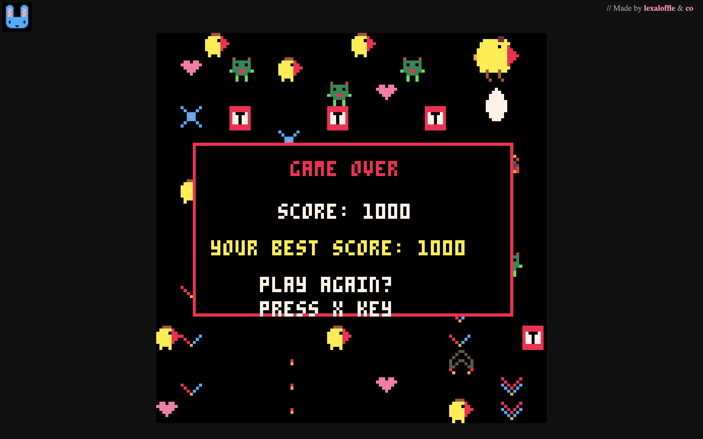 Endless arcade shooter. Move with arrow keys and press X to shoot. Survive infinite waves of chickens while collecting drops and upgrading your firepower as your score increases.